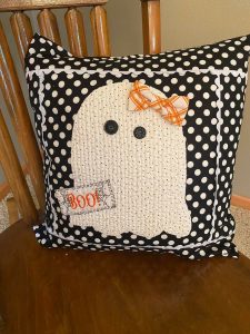 In this beginner level workshop, students will make this adorable ghost pillow, as pictured below! Students will be learning essential sewing skills on this project, including how to sew on buttons with their machines, applique, and even some quilting! This project is actually a pillow cover (not a stuffed pillow), which is better because they can take the cover off to wash and swap it out for different holidays 😉  The finished pillow cover will measure 16″x16″.
